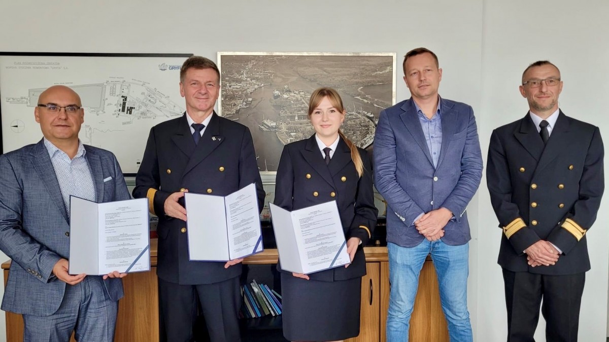 Politechnika Morska w Szczecinie i Stocznia Gryfia kontynuują strategiczną współpracę. We wtorek 16 września Daniel Opas, prezes Morskiej Stoczni Remontowej „Gryfia” podpisał umowę z profesorem Arturem Bejgerem, prorektorem Politechniki Morskiej w Szczecinie i panią mgr inż. Klaudią Skibińską, doktorantką z Wydziału Inżynieryjno-Ekonomicznego Politechniki, która pracuje nad stworzeniem nowatorskiego narzędzia do harmonogramowania produkcji.